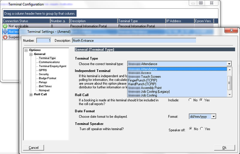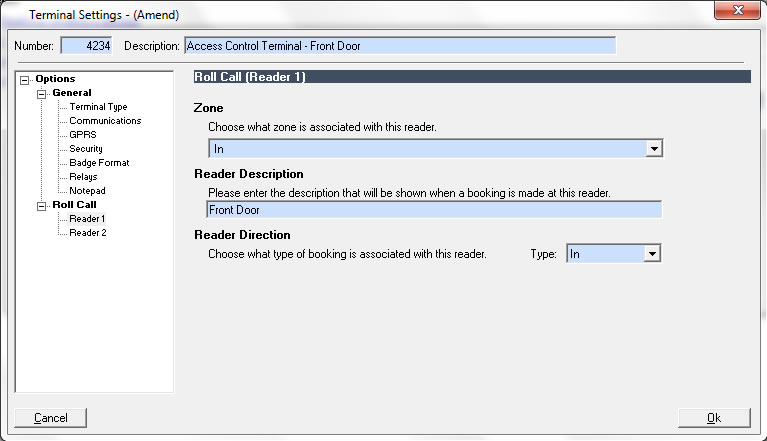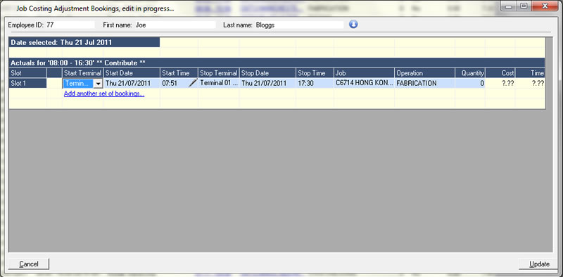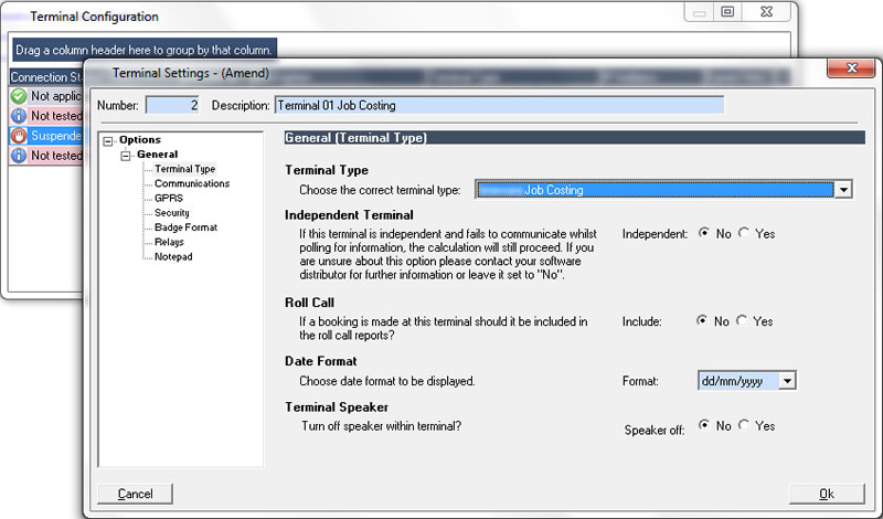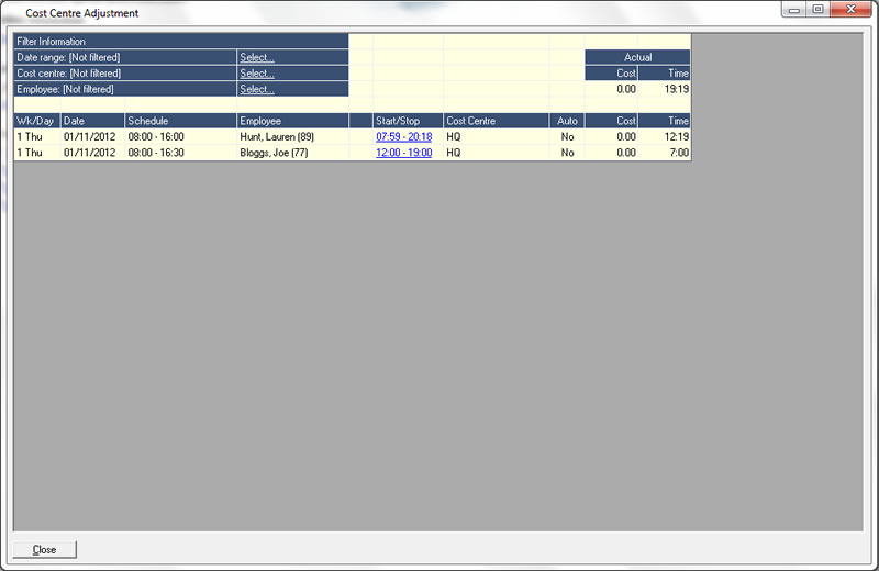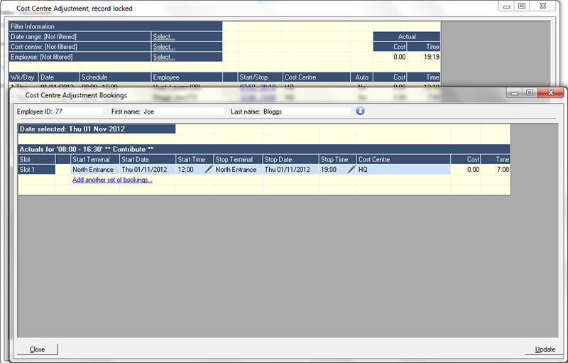 Specifying the cost centre can be achieved in a number of ways: some companies choose to install separate terminals in each cost centre whilst other companies require that the employee selects the correct cost centre from a list on the terminal screen.