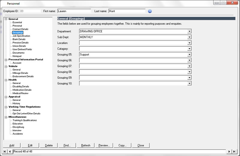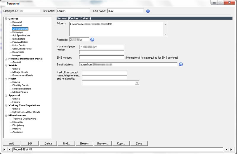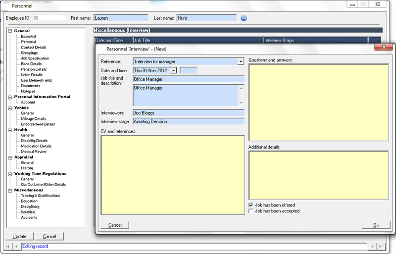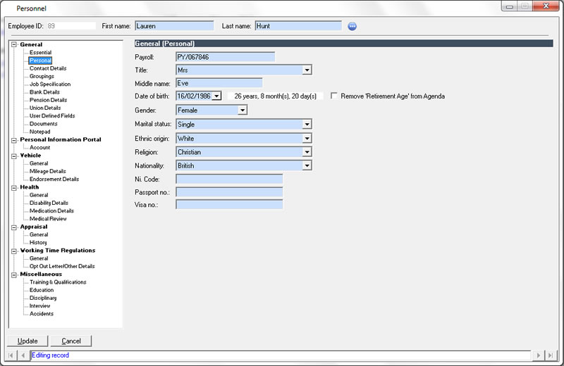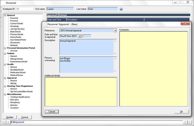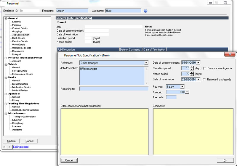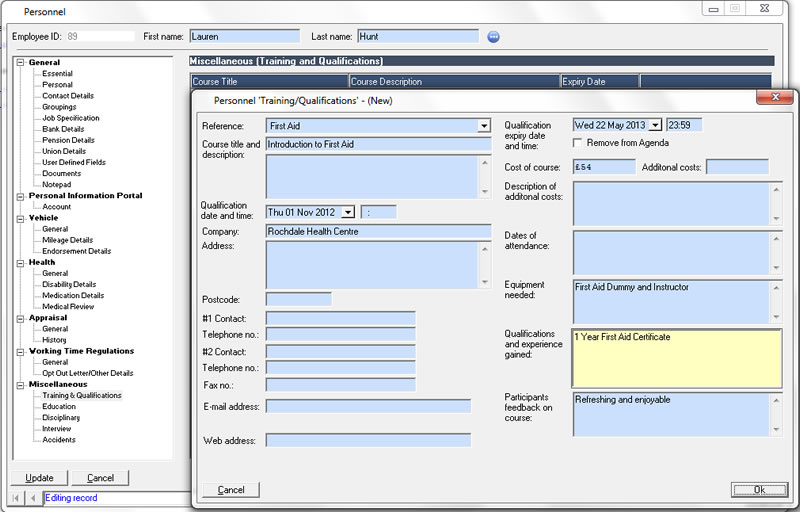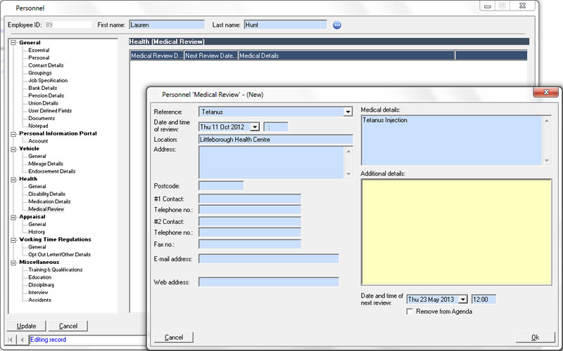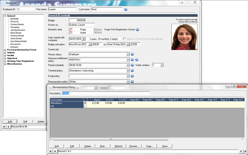 The personnel features integrate with the agenda to provide reminders of important events ranging from birthdays to certification renewal.